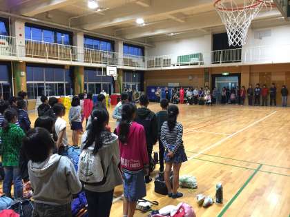 お迎えの方々に「ただいま帰りました!」と挨拶したあと、代表児童が修学旅行を振り返って、戦争の悲惨さを感じて平和の大切さを改めて知ったことや、友だちと楽しく過ごした時間について発表しました。