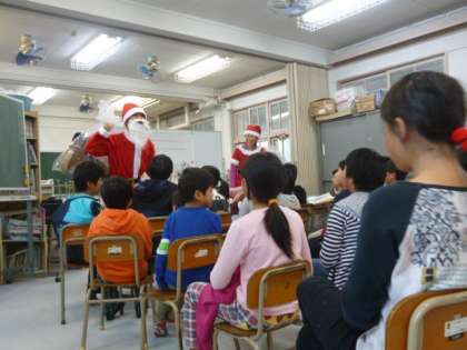 「メリークリスマス!」なかよし学級の教室にサンタさんがやってきました。みんなびっくり!「バーンゲーム」や「お手玉おとしゲーム」をして楽しみました。
