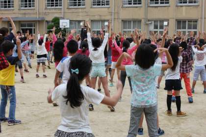 5月19日(月)から、学年練習がはじまりましたが、この日(22日)は全校演技のラジオ体操を、児童集会の時間に行いました。