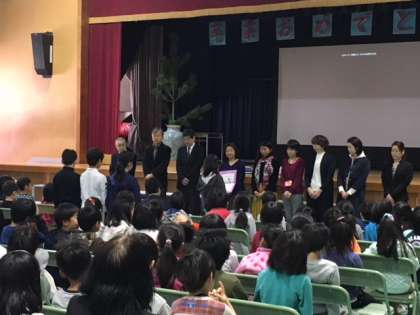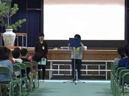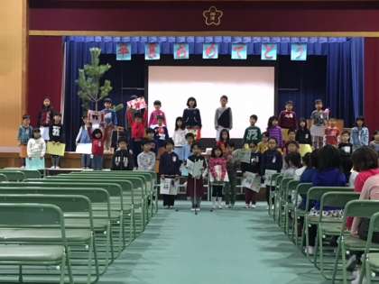今日の1時間目に修了式が行われました。修了証の授与の後、1年間お世話になった『見守り隊・絵本のくに・図書館ボランティア』の方々に感謝の気持ちを全員で伝えました。その他には、1年生の発表や、4年生の代表児童による作文朗読、校長先生や生活指導部長の話がありました。児童は、この1年間を振り返るとともに、新しい学年への期待感を持つことができました。