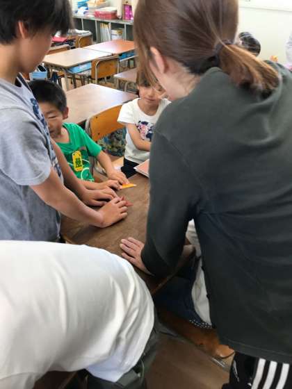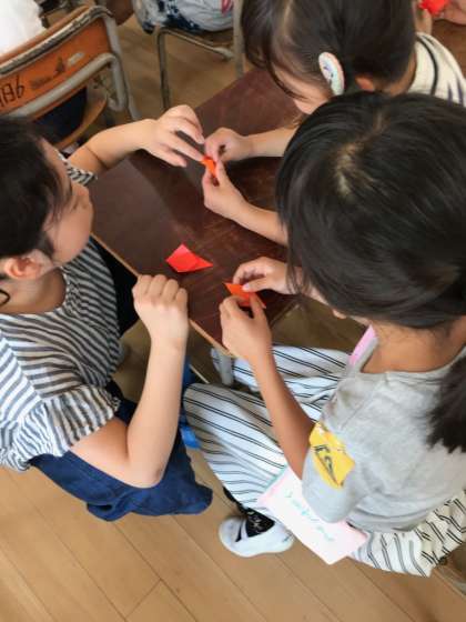 5月24日の2時間目は、たてわり班活動でした。全校のみんなで折り鶴をつくる時間です。6年生がリーダーになって、優しく鶴の折り方を教えてくれました。みんな、いっしょうけんめいに鶴を折りました。