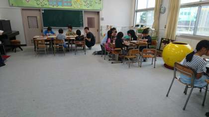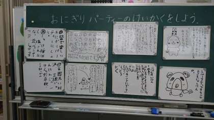 今日のなかよしタイムでは、グループで話し合って、おにぎりパーティーの計画をたてました。めあてを考えたり、おにぎりに入れたい具、パーティーでしたいことを考えたりしました。招待状にのせるイラストもそれぞれ楽しそうに書いていました。