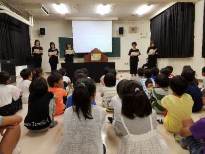 6月27日(水)は、絵本のくにのみなさんによる戦争のお話会がありました。子どもたちは、お話の中身に引き込まれ、戦争があったころの暮らしや子どもたちの様子について、たくさんのことを感じ取った様子でした。ありがとうございました。