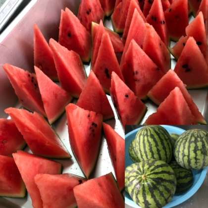 全てのすいかに中心部が行きわたるように、一つのすいかを64等分に切っています。