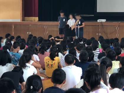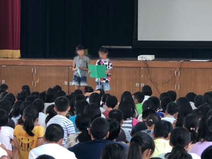 校長先生からのお話しと、神津小学校見守りキャラクター総選挙の結果発表。