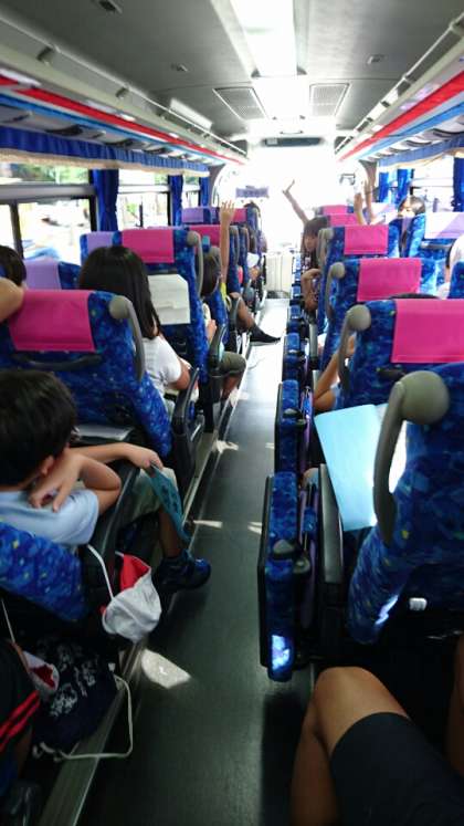 バスの中では、寝ている子もいれば、バスレクが始まりクイズを楽しんでいる子どももいます。クイズが盛り上がっています。