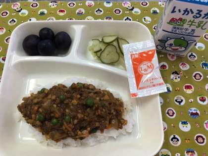 「大豆入りキーマカレー「は、牛挽肉、豚挽肉の他にひきわり大豆、たまねぎ、にんじんなどが入っています。この献立にも「米粉のカレールー」を使用しています。