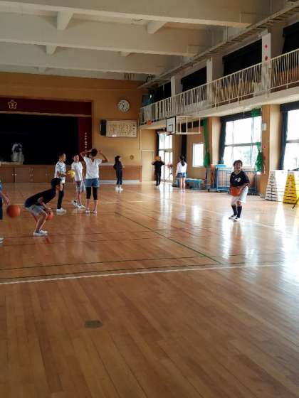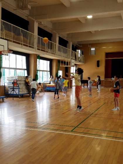 神津小学校では、講堂を子どもたちの遊びスペースとして順番に開放しています。運動会が終わって、今日からまた使い始めました。普段、休み時間ではできない、バスケットボールを楽しんでいる様子です。