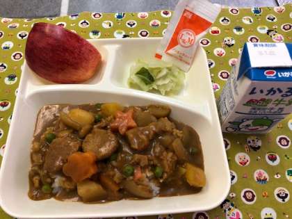 「ポークカレーライス」は小麦アレルギーのある児童も食べることができるように、米粉のカレールーの素を使用しています。豚肉は角切りでゴロゴロ、にんにく、セロリなどでスパイシーに仕上がっています。