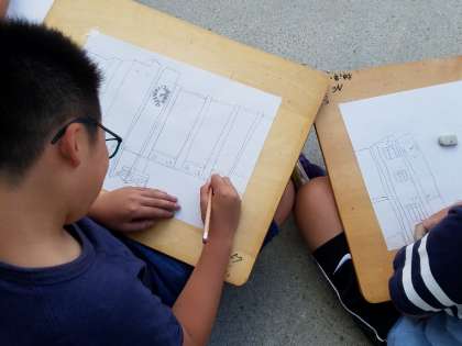 神津小学校の校舎をよく見て、ひとりひとりが一生懸命に描いています。