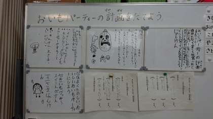 今回のなかよしタイムでは、おいもパーティーに向けてグループごとに相談して、めあてや作りたいもの、ゲームの内容を話し合って発表しました。招待状にのせるイラストも楽しそうに描いていました。さつまいも掘りももうすぐします。たくさんできているかな!?