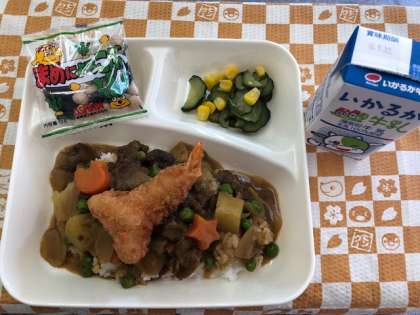 「エビフライにカレー!やった〜!」と大喜びの児童でした。