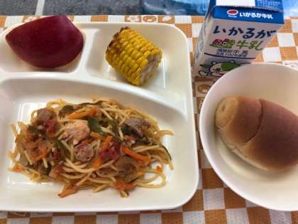 今日の献立は大人気のスパゲッティです。鶏肉とウインナーを主材ににんじん、玉ねぎ、ピーマン、トマト(缶)を使用しています。にんにくを香り良くいため、バジル、粗びきこしょうの使用で風味良くしあげています。焼きとうもろこしもりんごも大好評でした。