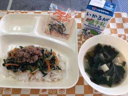 肉と野菜が別々の配缶になっており、盛りつけたご飯に、肉の具、野菜の具をのせて各自で混ぜて食べます。彩りもきれいで、大好評のメニューです。