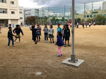 お昼休み、グラウンドのあちこちで長縄を跳びました。