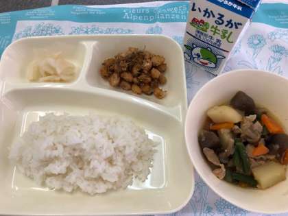 「じゃこ豆」は、ゆでたちりめんじゃこと、でんぷんをまぶして揚げた大豆を、甘辛いたれにからませます。ご飯によく合う、噛み応えのある児童に大好評な献立です。