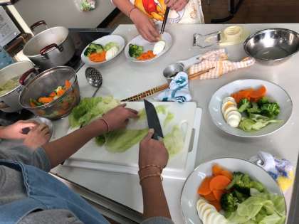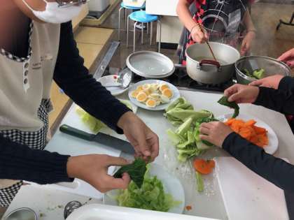 身支度を整え、調理の説明をしっかり聞き、各班の担当者がそれぞれ仕事をします。