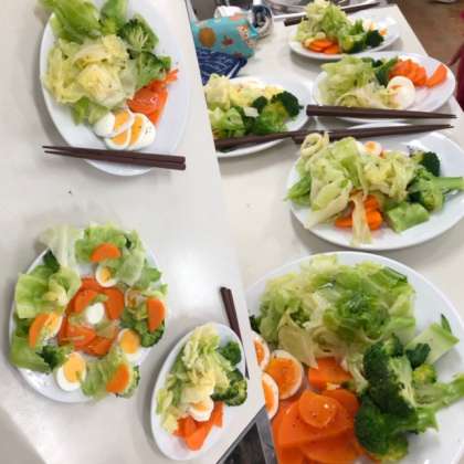 野菜を切り茹でて盛り付け。茹で卵も作りました。手作りの「フレンチドレッシング」をかけて...「いただきます!」