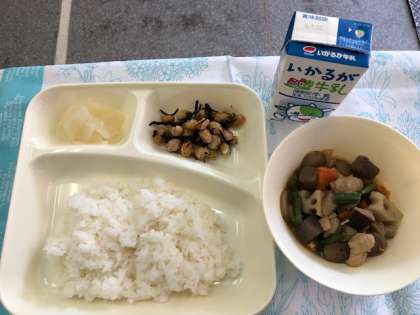 「ひじき豆」は、でんぷんをまぶし、油で揚げた大豆にひじきが入ったタレをからませます。鉄分や食物繊維を多く含む献立です。