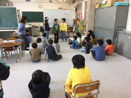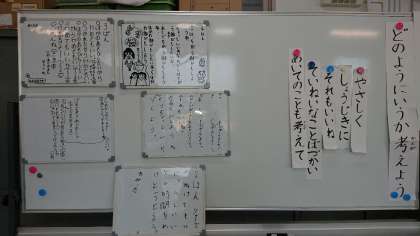 『みんなで遊んでいる途中で、遊びをやめたくなった時』という場面を設定し、どんな風に伝えたら相手のことも考えて自分の気持ちを正直に伝えられるかをグループで考えて発表しました。「もうやめて他の遊びをしてもいいかな?」や「時間をわけて後で違う遊びもしよう。」など色々な意見が出ました。