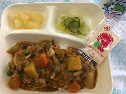 「ポークカレーライス」は、豚肉を主材にじゃがいも、にんじん、たまねぎなどを使用したカレーライスで、にんにくで風味を増しています。