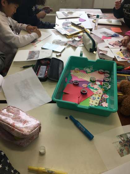 今日は一年間のなかよしタイムを振り返り、思い出のアルバムを作りました。画用紙に写真を貼り、シールやマスキングテープで飾り付けをしました。
