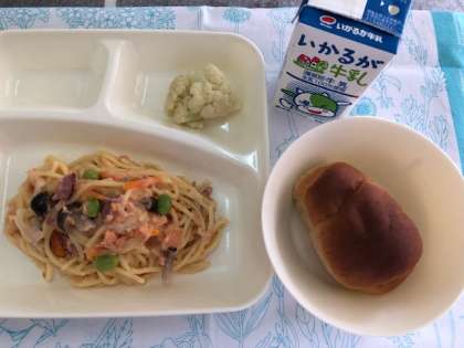 「さけのクリームスパゲッティ」は、ベーコンの旨みを生かし、手作りのホワイトルウ、牛乳、クリームを使用した紅ざけの淡い色がきれいなクリームスパゲッティです。