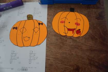 「かわいくかけた!」「カラフルにしたよ」と嬉しそうにおばけやかぼちゃの顔を描いていました。