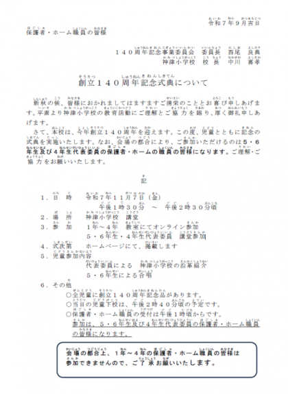 式典会場への参加は、5・6年生の保護者・ホーム職員の皆様と、4年生代表委員の保護者・ホーム職員の皆様となります。