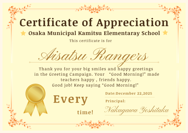 「あいさつレンジャー」の取り組みへの感謝状が贈られました。