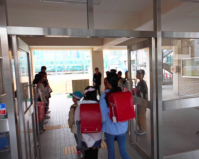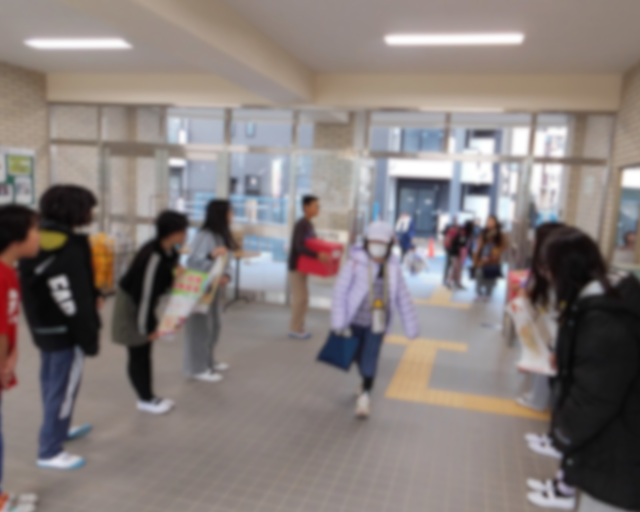 代表委員の児童が、登校時の正門玄関で、