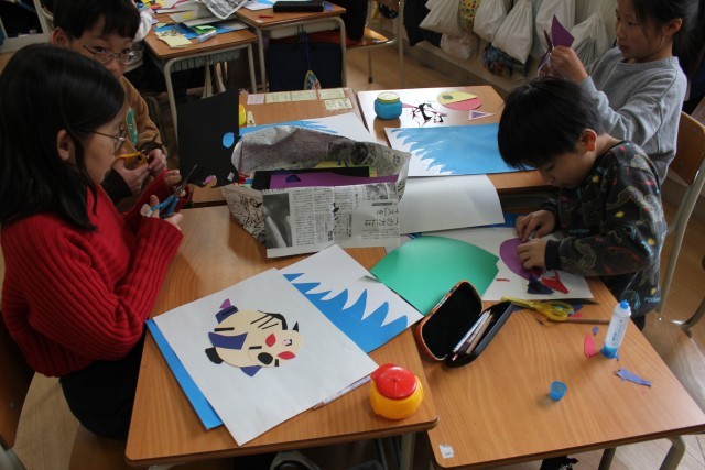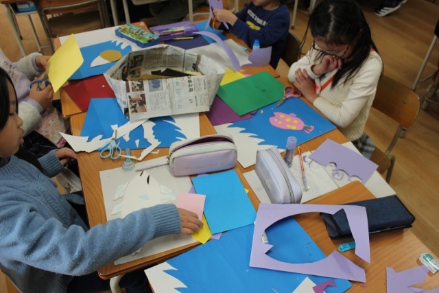 ※魚をデザインする画用紙は、端紙(印刷や加工の過程で生じる余り紙、切れ端を使っています。地球にやさしい図画工作です!)