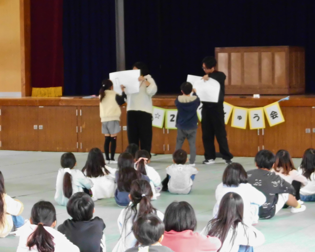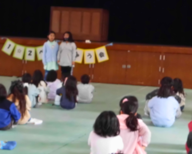 2年生の進行で、はじめのあいさつ、2年生での学習内容(かけ算の九九や画数の多い漢字の紹介)、あそび、