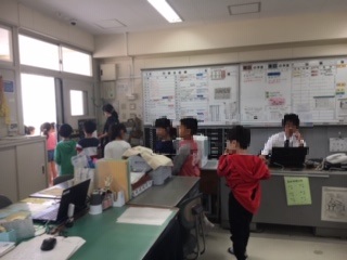 2年生が学校探検をしました。これは1年生に学校を紹介するための準備のためです。職員室や校長室など室内まで入ることはめったにないので、興味津々で見学していました。