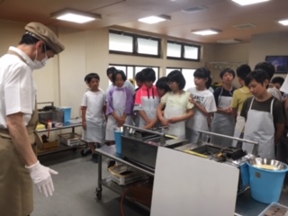 楽しみにしていた、もみじ饅頭づくりの説明を聞いています。包装まで自分でさせてもらえます。