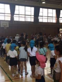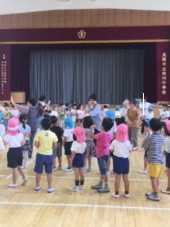 幼稚園の子どもと1年生の子どもたちが、地域の方に盆踊りを教えていただきました。「淀川音頭」や「あんパンマン音頭」などの踊りを練習しました。7月の「夕べの集い」で、ぜひ踊ってほしいです。