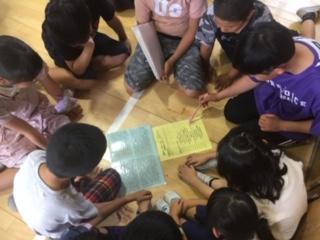 楽しいお店にたくさんの人をよぶために、それぞれ工夫を凝らしてお店を紹介しました。その後、たてわり班で、お店を回る順番を相談しました。今から金曜日が楽しみです。