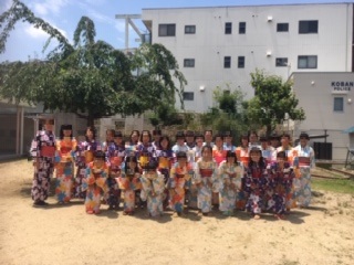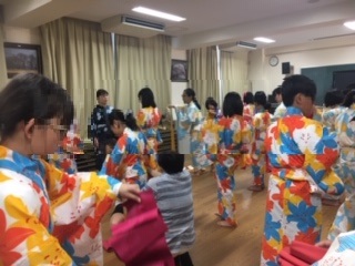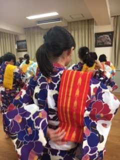 まず、一通りゆかたの着方の説明を聞きました、その後、3〜4人ごとに一人の先生がついていただき、丁寧に教えていただきました。子どもたちは、自分でゆかたを着れたことに感動していました。