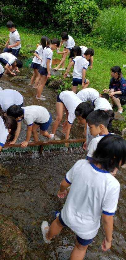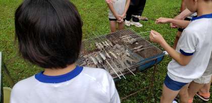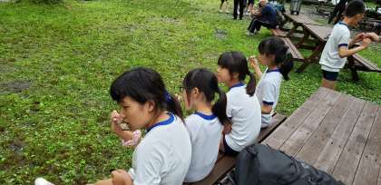 雨はやみ、曇り空の中魚つかみが始まりました。川の中に入ると、まるで氷水のような冷たさにびっくりしていました。1人1匹あまごを手でつかまえて、その場で炭で焼いてもらい、いただきました。命をいただくありがたみを感じることができたと思います。