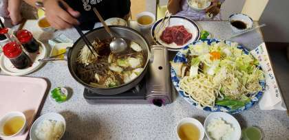 今日の夕食は、すきやきです。自分たちでコンロを扱い、火の調節などをしたり、具材を入れたりしました。みんなおいしそうに食べ、ほとんどの班が完食していました。
