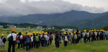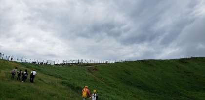 ゲレンデまで来ました。みんなでヤッホー!!と叫び、記念写真も撮りました。少し風が強いですが、雨は止んでいます。頂上まであともうちょっと!