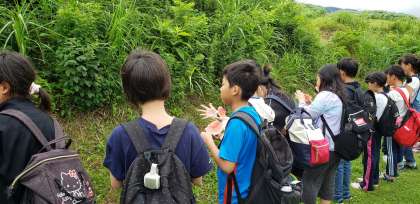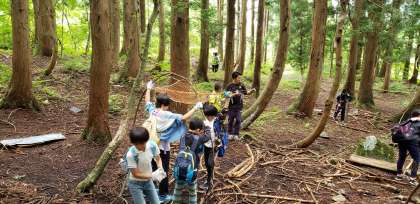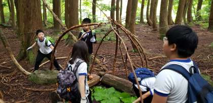 落ちている木の枝や廃材などを使って、各班で秘密基地を作りました。必要な材料を探して運んだり、木と木を紐で繋げたりなど、思い思いの基地を考えて作ることができました。その後、おやつのスイカをいただきました。