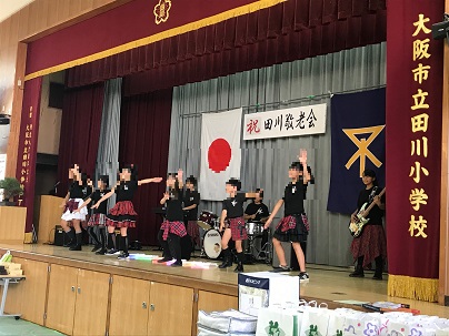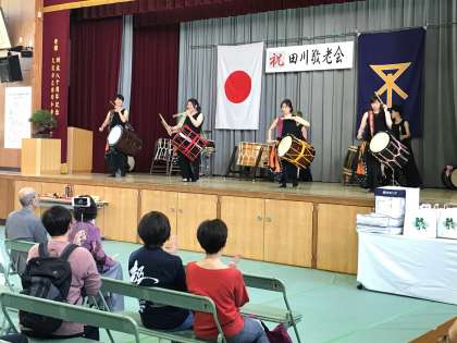 オープニングは、田川幼稚園の歌やダンス、田川子ども会の音楽クラブの演奏でした。その後、参加最高齢者の方と金婚の方の表彰、迫力あるたいこの演奏などがあり、最後にラッキーカード抽選会がありました。