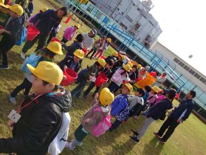 朝、町会ごとに一時避難場所に集合し、地域の方々といっしょに小学校まで移動してきた子どもたち。
