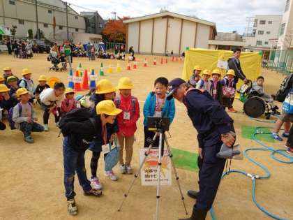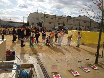 バケツ消火リレー、消火器体験、起震車体験、車いす体験をしました。