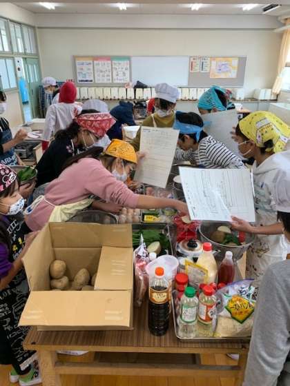 事前に、各班ごとにお弁当に入れるおかずを話し合い、材料や作り方をタブレットで調べました。