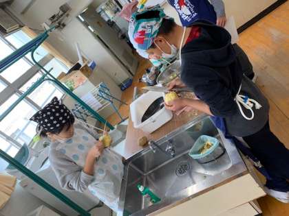 最初は、包丁で皮をむくのを怖がっていましたが、むき方を覚えると上手にむくことができていました。