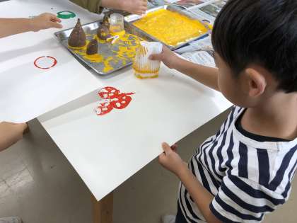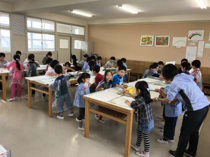 1年生の学習園で秋に収穫した「さつまいも」が不作となり、どのように活用しようか?と考えた末、「芋版にしよう!」と決まりました。そして先週、図画工作科「うつしたかたちから」の学習で、さつまいもや洗濯ばさみ・ネットなどを材料にしてスタンプあそびをしました。「どんな形にうつるのかな?」と子どもたちは興味津々!自分の好きな色を使って、素敵な作品を仕上げました。教室に掲示してありますので見てください。