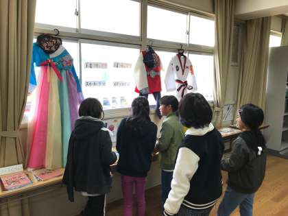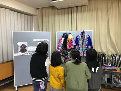さまざまな国や民族の文化について知るために、万博記念公園にある国立民族学博物館から展示物をお借りし、多目的室に展示しました。