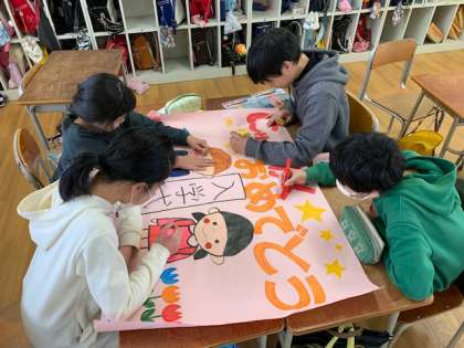 児童会の運営委員会では、6年生は、来年度の入学式の日に新一年生の教室用にお祝い掲示を作りました。